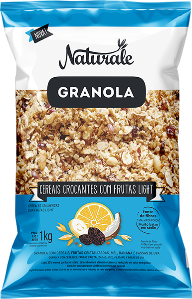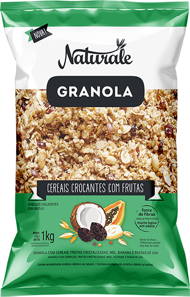 Aveia em flocos, frutas cristalizadas (mamão e laranja em cubos), açúcar mascavo, açúcar cristal, farinha de aveia, banana passa, maltodextrina, melado de cana, cereal três grãos (semolina de milho enriquecida com ferro e ácido fólico, farinha de arroz e aveia, uvas passas, malte de cevada, flocos de milho, mel de abelha, flocos de arroz, óleo de girassol, fibra de trigo, gérmen de trigo, coco ralado, aromatizante idêntico ao natural de baunilha, corantes naturais (caramelo e urucum) e antioxidante.