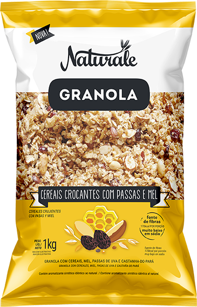 Aveia em flocos, açúcar mascavo, açúcar cristal, farinha de aveia, mel, melado de cana, uvas passas escuras, fibra de trigo, flocos de arroz, flocos de milho, óleo de girassol, malte de cevada, cereal três grãos (semolina de milho enriquecida com ferro e ácido fólico, farinha de arroz e aveia), gérmen de trigo, castanha do Pará, gergelim, aroma idêntico ao natural de baunilha, corantes naturais (caramelo e urucum) e antioxidante.
