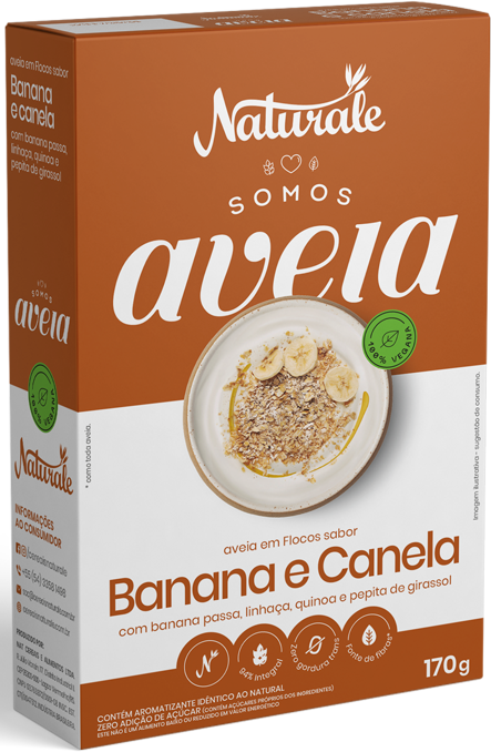 Aveia em Flocos, Açúcar Refinado, Banana Desidratada em flocos, Canela em Pó, Aroma idêntico ao natural de Banana.
